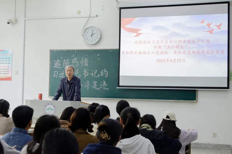 4月23日下午,台湾素人av 分党校举办第五期党员发展对象暨预备党员培训班第三讲,校关工委副秘书长沈玉华受邀为学生党员做《追随感悟习近平总书记的青春奋斗足迹》专题讲座。